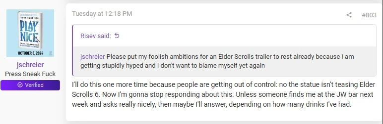 „Ich sage das jetzt ein letztes Mal, weil die Leute komplett durchdrehen: Nein, die Statue teast nicht Elder Scrolls 6. Ich werde dazu nichts mehr sagen. Außer jemand findet mich nächste Woche an der JW-Bar und fragt höflich - hängt dann davon ab, wie viele Drinks ich hatte.“
