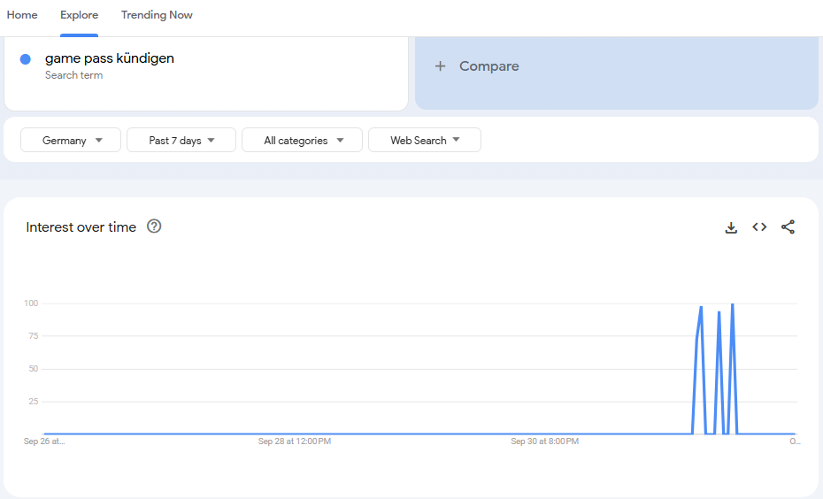 Die Wut lässt sich messen: Laut Google Trends schoss die deutschlandweite Suche (weltweit ebenfalls) nach „Game Pass kündigen“ auf den Maximalwert von 100 - eine der am meisten gesuchten Phrasen überhaupt zu diesem Zeitpunkt: