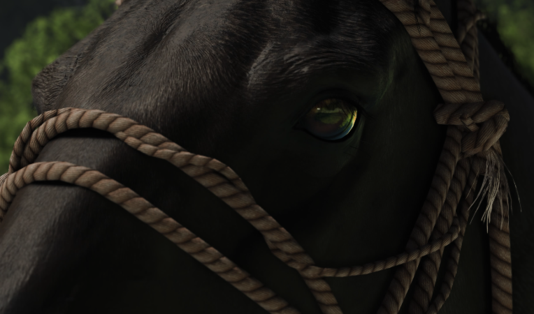 Die Umgebung spiegelt sich in den Augen des Pferdes.
