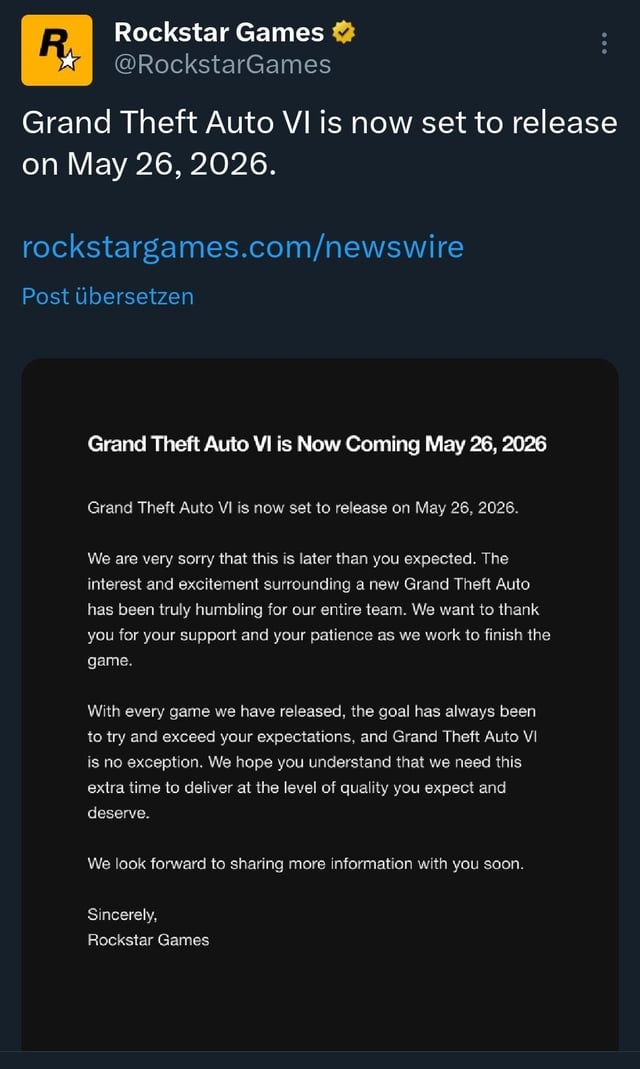 „Wir müssen euch leider mitteilen, dass Grand Theft Auto VI erst am 26. Mai 2026 erscheint. Diese Verzögerung ist nötig, um sicherzustellen, dass das Spiel euren Erwartungen entspricht und die Qualität liefert, die ihr verdient.“