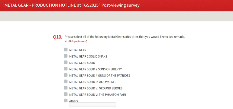 Die Umfrage trägt den Titel „Metal Gear - Production Hotline at TGS2025“ und umfasst Fragen zu Gameplay, Präsentation und Community-Arbeit. Besonders spannend ist jedoch der Abschnitt, in dem Spieler*innen nach ihren Wünschen für künftige Neuauflagen gefragt werden.