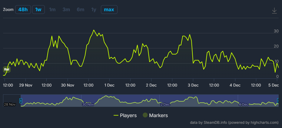 Das Free Starter Pack sollte laut Hoffnung der Entwickler*innen für frischen Zustrom sorgen. Die Realität auf Steam sieht jedoch ernüchternd aus. Laut Daten der bekannten Tracking-Seite SteamDB erreichte die kostenlose Version am 30. November lediglich einen Peak von 32 gleichzeitigen Spieler*innen und fiel anschließend zeitweise auf gerade einmal vier Nutzer*innen zurück. Zum Vergleich: Die Vollversion schaffte es zum Start immerhin auf 3.302 gleichzeitig aktive Spieler*innen.