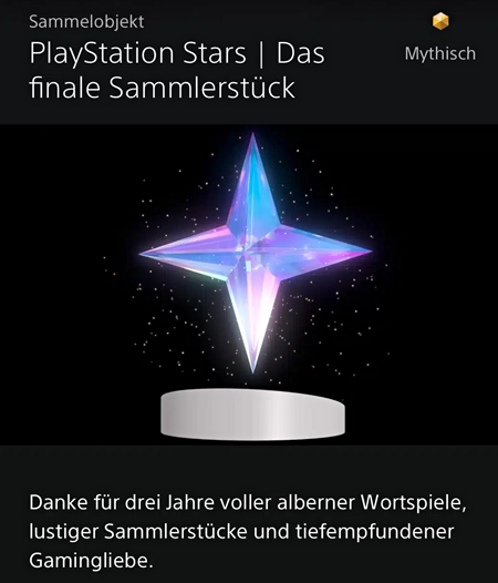 Wer noch noch einen glitzernden Schlussmoment erleben will, kann sich ab sofort das finale Sammlerstück sichern ein symbolträchtiger PlayStation-Stern als Erinnerung an drei Jahre Punktejagd.
