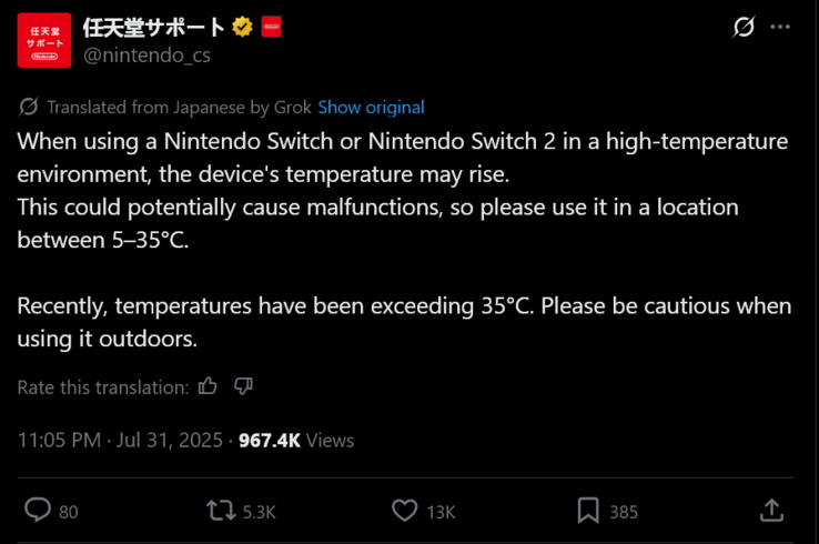 Auf X (ehemals Twitter) erklärt Nintendo nun, was vermutlich die Ursache für das Hitzeproblem ist: Die Switch 2 darf nur in einem Temperaturbereich von 5 bis 35 Grad Celsius verwendet werden.