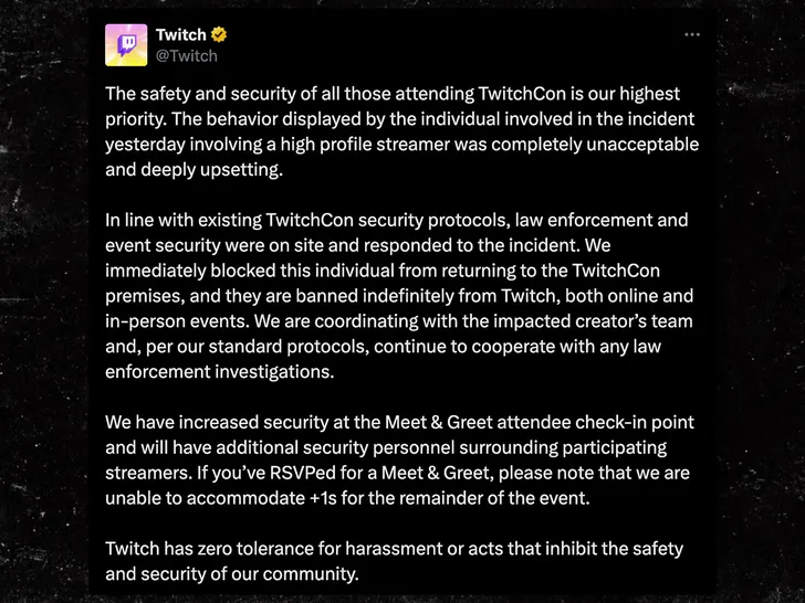 Twitch veröffentlichte nach dem Vorfall ein Statement, in dem das Verhalten des Angreifers als „völlig inakzeptabel und zutiefst beunruhigend“ bezeichnet wurde. Laut dem Unternehmen sei der Mann vom Event verwiesen und dauerhaft von allen Twitch-Veranstaltungen sowie der Plattform selbst ausgeschlossen worden. Zudem versprach Twitch eine verstärkte Sicherheitspräsenz für den Rest des Wochenendes.
