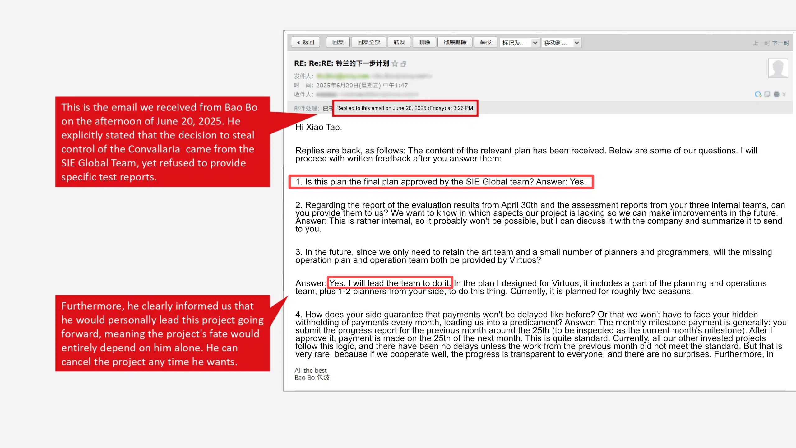 Zu den vorgelegten Dokumenten gehören laut MP1st auch E-Mail-Verläufe zwischen Loongforce und Bo Bao, dem Director of China Game Production bei Sony Interactive Entertainment. Diese wurden übersetzt und sollen die Anschuldigungen untermauern - insbesondere im Hinblick auf ausstehende Zahlungen sowie angebliche Drohungen, das Support-Studio Virtuos mit der kompletten Entwicklung von Convallaria zu betrauen.