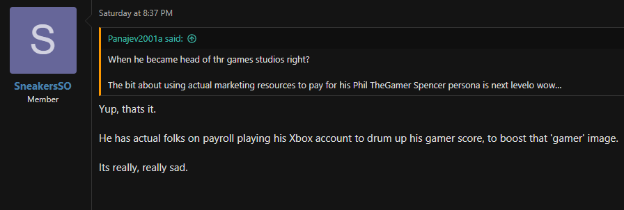 In demselben Thread, in dem SneakersSO erklärte, dass die nächste Xbox-Generation intern auf der Kippe steht (laut Jez Corden (Windows Central) Fake-News), reagierte der Insider auf Diskussionen über die Führungsrolle von Phil Spencer.