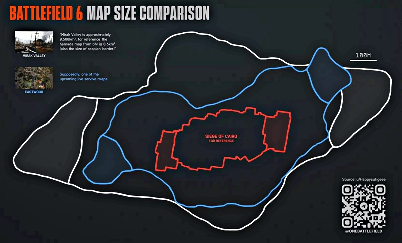 Um zu zeigen, wie groß die neuen Karten wirklich sind, legten Fans die Layouts von Mirak Valley und Eastwood über die bekannte Map Belagerung von Kairo. Das Ergebnis: Eastwood ist doppelt so groß und Mirak Valley übertrifft die Fläche gleich um das Vierfache.