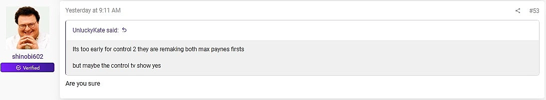 Im Forum von ResetEra meldete sich der Insider in einer Diskussion über die Game Awards 2025 zu Wort, als es um die Frage ging, ob wir mit einer offiziellen Enthüllung von Control 2 rechnen dürfen.