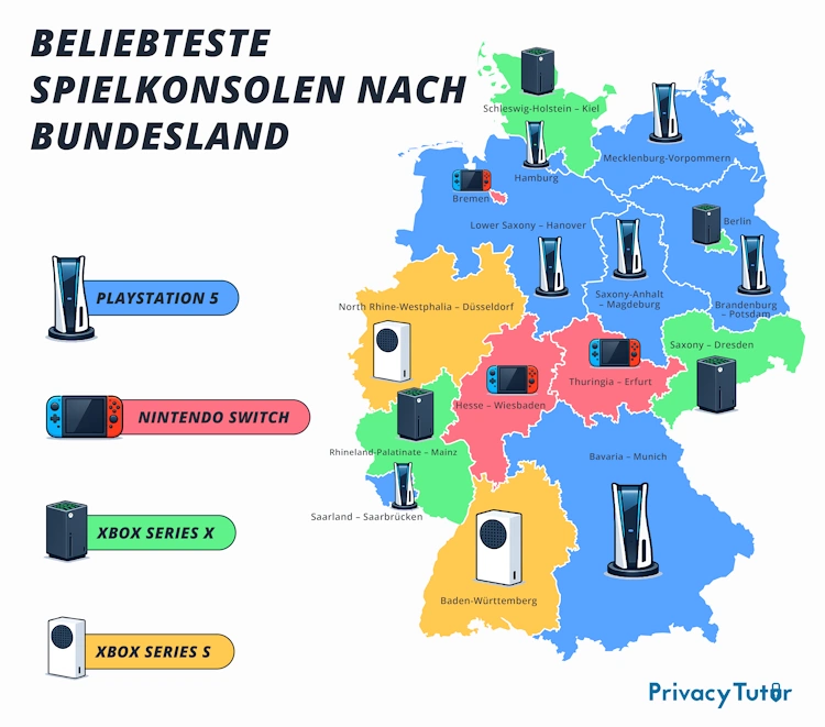 Doch die Konkurrenz ist stärker, als viele erwarten würden: Xbox Series X und Xbox Series S kommen zusammen auf sechs Bundesländer, in denen sie die Spitzenposition einnehmen.