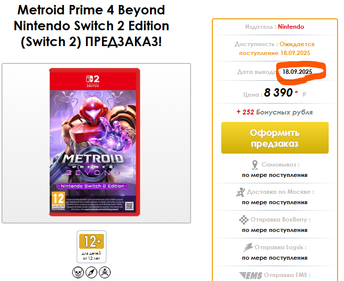 Reddit-Nutzer SHoulderAdvanced6854 machte auf eine Listung des russischen Händlers Videoigr aufmerksam, der Metroid Prime 4: Beyond mit dem 18. September als Release-Datum anführte.