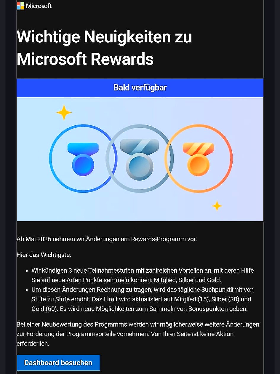 Microsoft überarbeitet sein Rewards-Programm grundlegend und führt ab Mai ein neues Stufensystem ein. Nutzer*innen sammeln künftig in den Kategorien Mitglied, Silber und Gold Punkte mit steigenden Vorteilen, Limits und Bonusmöglichkeiten.