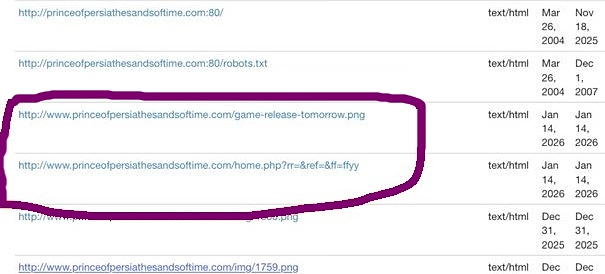 Fans entdeckten kürzlich die Webseite princeofpersiathesandsoftime.com, die offenbar bereits 2022 über den Domain-Registrar Gandi.net registriert wurde. Als Inhaber ist Ubisoft Entertainment hinterlegt. Mitte Dezember 2025 erfolgte eine Aktualisierung, möglicherweise eine Laufzeitänderung. Momentan läuft die Domain bis März 2027.
