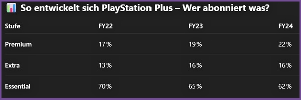 Sony setzt auf die Formel: Mehr Inhalte + bessere Sichtbarkeit = mehr Premium-Abos. Und bisher scheint der Plan aufzugehen. Die Extra- und Premium-Stufen gewinnen an Beliebtheit, Essential verliert leicht an Boden. Die nächsten Monate werden zeigen, ob Sony den Spagat zwischen Preissteigerung und Nutzerzufriedenheit meistert – oder ob man sich übernimmt.