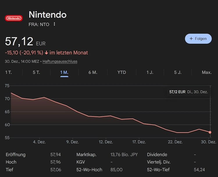 Die Nintendo-Aktie fällt im Dezember um rund 20 %. Grund sind stark gestiegene Produktionskosten für die Switch 2, insbesondere teurer Speicherchips und RAM-Module, die Investoren Sorgen um Gewinnmargen bereiten.