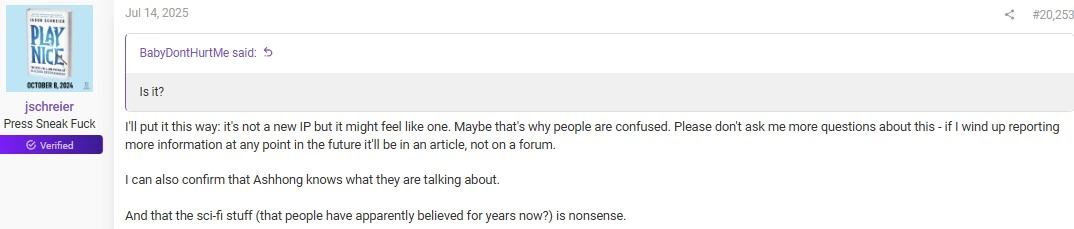 „Ich sage es mal so: Es ist keine neue IP, aber es fühlt sich vielleicht so an. Vielleicht sind die Leute deshalb verwirrt. Bitte fragt mich nicht weiter dazu. Wenn ich in Zukunft mehr darüber berichte, dann in einem Artikel, nicht in einem Forum.“