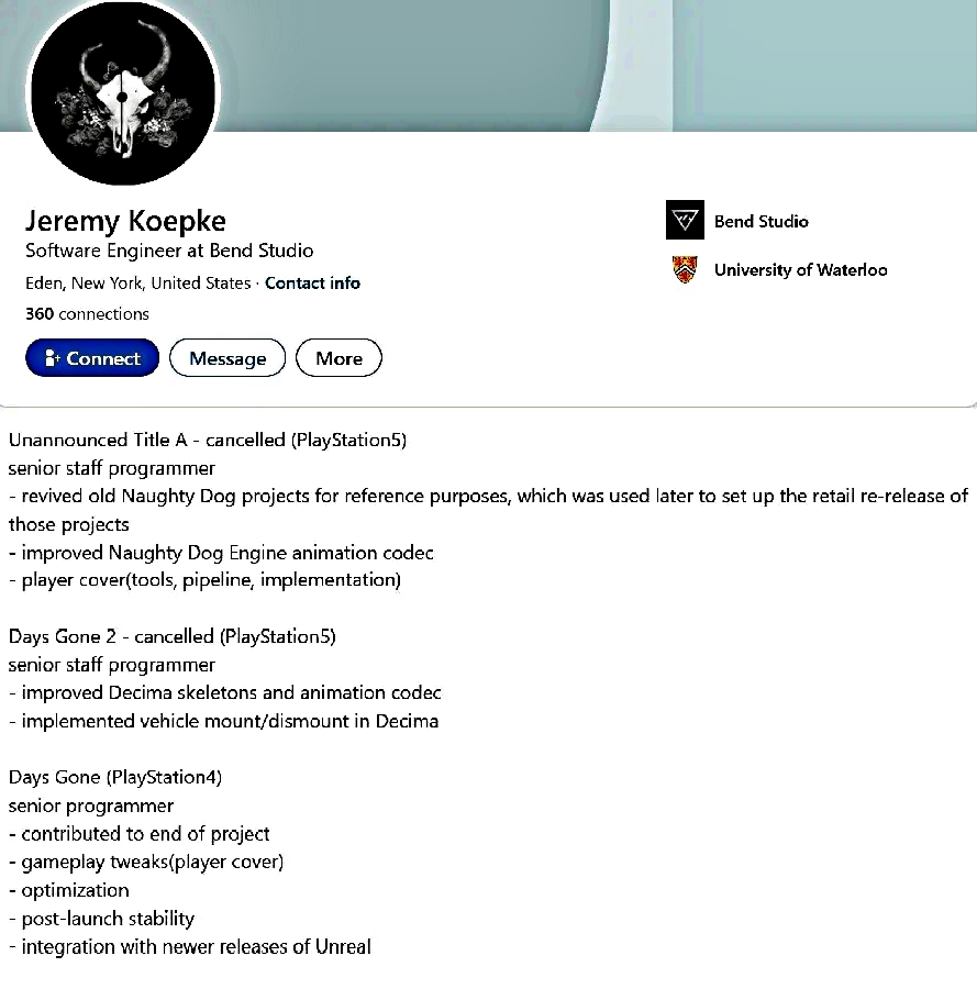 Laut dem LinkedIn-Profil von Jeremy Koepke, einem Software Engineer bei Bend, arbeitete das Studio mit Naughty Dogs hauseigener Engine. Ein ungewöhnlicher Schritt, da diese normalerweise nur intern genutzt wird.