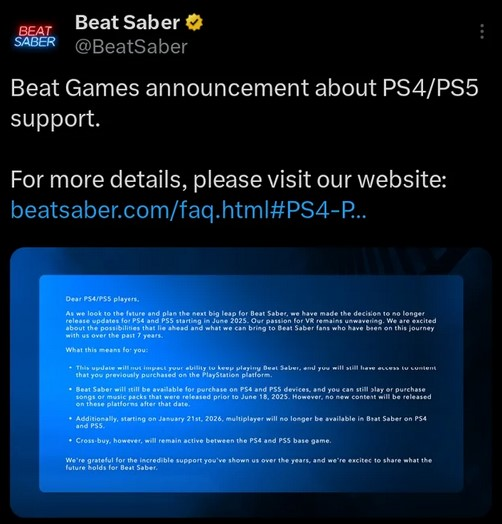 Einer der größten VR-Hits macht auf PlayStation VR und PS VR2 Schluss: Beat Games stellt den Support ein. Updates? Fehlanzeige. Multiplayer? Geschichte. Der Rückzug von Beat Saber markiert einen weiteren Rückschlag für Sonys strauchelndes VR-Ökosystem.
