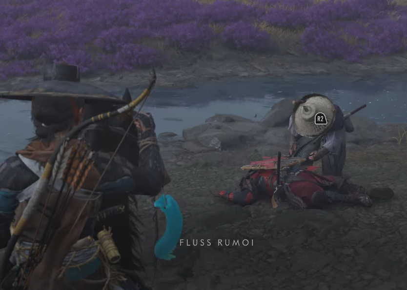 Nun geht’s zurück in die Ebene. Reitet Richtung Norden zum Fluss Rumoi, wo ihr einen Ronin seht, der gerade eine Leiche plündert. Dieser Ronin trägt die vierte Windglocke bei sich - besiegt ihn, um sie zu erhalten.