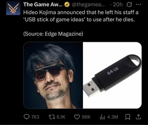 „Ich habe meinem persönlichen Assistenten einen USB-Stick mit all meinen Ideen darauf gegeben, eine Art Testament“, erzählt Kojima in einem Interview mit dem Edge Magazine. Was auf den ersten Blick fast ein wenig filmreif klingt, ist für ihn eine ernste Angelegenheit: Der Stick soll sicherstellen, dass Kojima Productions auch nach seinem Tod noch neue Spiele entwickeln kann, ganz im Geiste ihres Schöpfers.