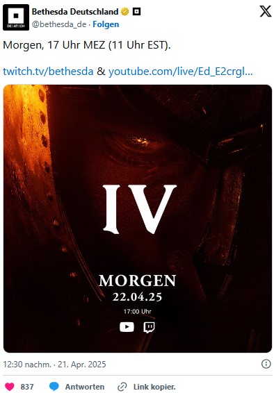Bethesda macht eindeutige Ankündigung, morgen Live-Stream auf YouTube und Twitch